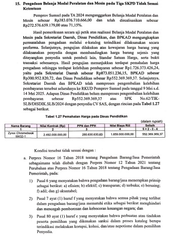 Penyimpangan yang hampir sama juga terjadi pada Pengadaan Belanja Modal pada Dinas Pendidikan Sumsel. Hasil pemeriksaan secara uji petik pada Pengadaan Barang Zyrek Chromebook M432-1 yang juga dilaksanakan CV. SAS dengan SPK No. 62/TIK-SLB/DISDIK.SLB/2024 nilai kontrak Rp 2.492.000.000,-, PPN dan PPH Rp 280.630.630,63, nilai biaya rill Rp 1.659.000.000,- ditemukan pemahalan harga sebesar Rp 552.369.369,37. Pengadaan yang dilaksanakan melalui E-Katalog ini juga terindikasi dilakukan secara proforma.