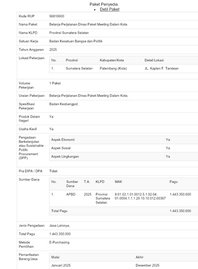 Data/informasi yang dihimpun DETEKTIFSWASTA bersama Koordinator Komunitas Masyarakat Anti Korupsi Indonesia (K-MAKI) antara lain dari SiRUP Portal Pengadaan Nasional LKPP, terdapat sebanyak 23 paket Belanja Perjalanan Dinas Paket Meeting Dalam Kota Tahun 2025 di Badan Kesatuan Bangsa dan Politik Provinsi Sumatera Selatan dengan total pagu Rp 3.292.005.000,-.