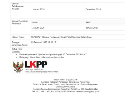 - Kode RUP 59801533, Belanja Perjalanan Dinas Paket Meeting Dalam Kota, Volume Pekerjaan 1 Paket, Pagu Rp 80.000.000,-; Waktu Pemilihan : Januari 2025