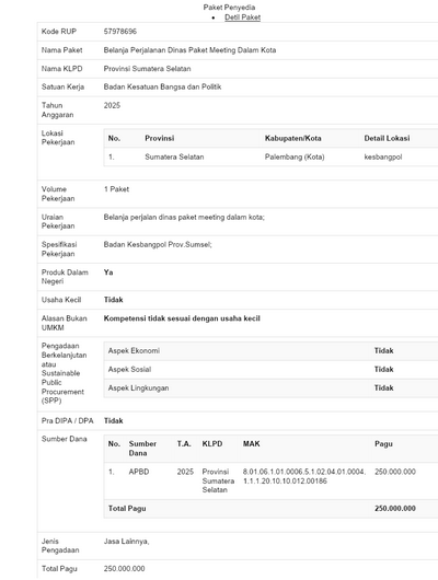 - Kode RUP 57978696, Belanja Perjalanan Dinas Paket Meeting Dalam Kota, Pagu Rp 250.000.000,-, Volume Pekerjaan 1 Paket, Waktu Pemilihan : Januari 2025