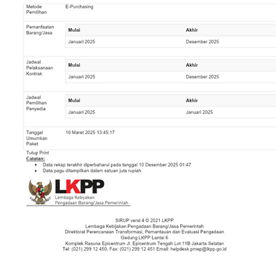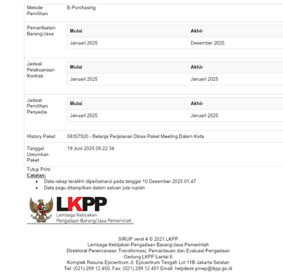 - Kode RUP 59806763, Belanja Perjalanan Dinas Paket Meeting Dalam Kota, Volume Pekerjaan 1 Paket, Pagu Rp 80.000.000,-; Waktu Pemilihan : Januari 2025