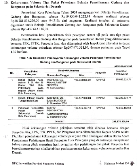 Hasil pemeriksaan fisik pekerjaan secara uji petik atas 3 paket Belanja Pemeliharaan Gedung dan Bangunan pada Sekretariat Daerah Kota Palembang sumber dana APBD tahun 2024 yang dilaksanakan bersama PPK, PPTK, Penyedia dan didampingi Inspektorat ditemukan kekurangan volume pekerjaan sebesar Rp 297.970.338,99 (atau 50,01 % dari total nilai kontrak Rp595.770.177,13-red).