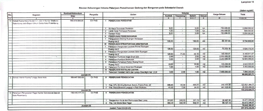 Adapun 3 paket dimaksud yakni : pekerjaan Rehab Ruang Kerja Asisten I, II dan III Kantor Walikota Palembang pada Bagian Umum Setda Kota Palembang, nilai kontrak Rp 196.678.000,-, dengan penyedia CV. PAB ditemukan kekurangan volume/kelebihan pembayaran sebesar Rp 65.695.321,71 atau 33,40% dari nilai kontrak.