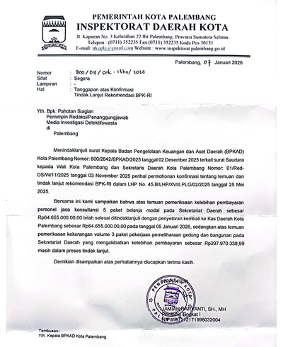 “Untuk temuan kelebihan pembayaran personel Jasa Konsultansi 5 paket Belanja Modal pada Sekretariat Daerah sebesar Rp 64.655.000,- telah selelasai ditindaklanjuti dengan penyetoran kembali ke Kas Daerah Kota Palembang sebesar Rp 64.655.000,- pada tanggal 05 Januari 2026”, tulis Jamiah dalam surat yang ditembuskan kepada Kepala BPKAD Kota Palembang.