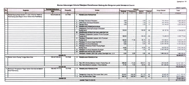 Adapun 3 paket Belanja Pemeliharaan Gedung dan Bangunan tersebut dimaksud masing-masing pekerjaan Rehab Ruang Kerja Asisten I, II dan III Kantor Walikota Palembang pada Bagian Umum Setda Kota Palembang, nilai kontrak Rp 196.678.000,-, dengan penyedia CV. PAB ditemukan kekurangan volume/kelebihan pembayaran sebesar Rp 65.695.321,71 atau 33,40% dari nilai kontrak.