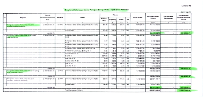 - Peningkatan Kualitas Permukiman Kelurahan Pulo Kerto Kec. Gandus, penyedia CV. KPS, nilai kontrak Rp 2.988.200.000,-, kekurangan volume Perkerasan Beton Semen (dengan ready mix K-250) sebesar Rp 413.173.302,93 dan kekurangan volume Saluran Beton sebesar Rp 93.012.059,86. Total kekurangan volume/kelebihan pembayaran sebesar Rp 506.185.382,79