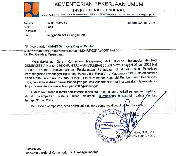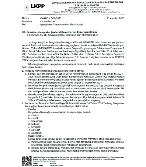 Permintaan Konfirmasi/Klarifikasi DETEKTIFSWASTA tanggal 27 Agustus 2025 No. 032/Red-DS/W/08/2025 terkait tindak lanjut Rekomendasi BPK RI dalam Laporan Hasil Pemeriksaan No. 51.B/LHP/VIII.PLG/05/2025 tanggal 25 Mei 2025, yang ditujukan kepada Kepala Dinas Pendidikan Sumsel, sampai berita ini ditulis belum mendapat tanggapan. (tim)
