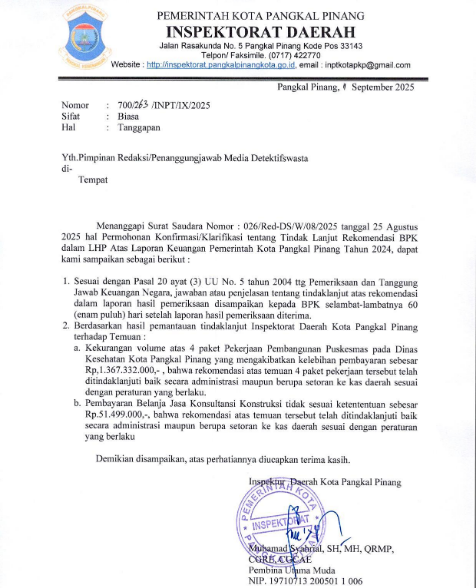 Walikota Pangkalpinang yang dikonfirmasi DETEKTIFSWASTA melalui surat No. 026/Red-DS/W/2025 tanggal 25 Agustus 2025 terkait tindak lanjut Rekomendasi BPK dalam LHP No. 97.B/LHP/XVIII.PPG/05/2025 tanggal 23 Mei 2025 tersebut dalam jawaban tertulis No. 700/263/INPT/IX/2025 tanggal 1 September 2025 yang ditandatangani Inspektur Daerah Kota Pangkalpinang, Muhamad Syahrial, SH, MH, QRMP menjelaskan sesuai dengan Pasal 20 ayat (3) Undang-Undang No. 5 tahun 2024 tentang Pemeriksaan dan Tanggung Jawab Keuangan Negara, jawaban atau penjelasan tentang tindak lanjut atas rekomendasi dalam lapaoran hasil pemeriksaan disampaikan kepada BPK selambat-lambatnya 60 hari setelah laporan hasil pemeriksaaan diterima.