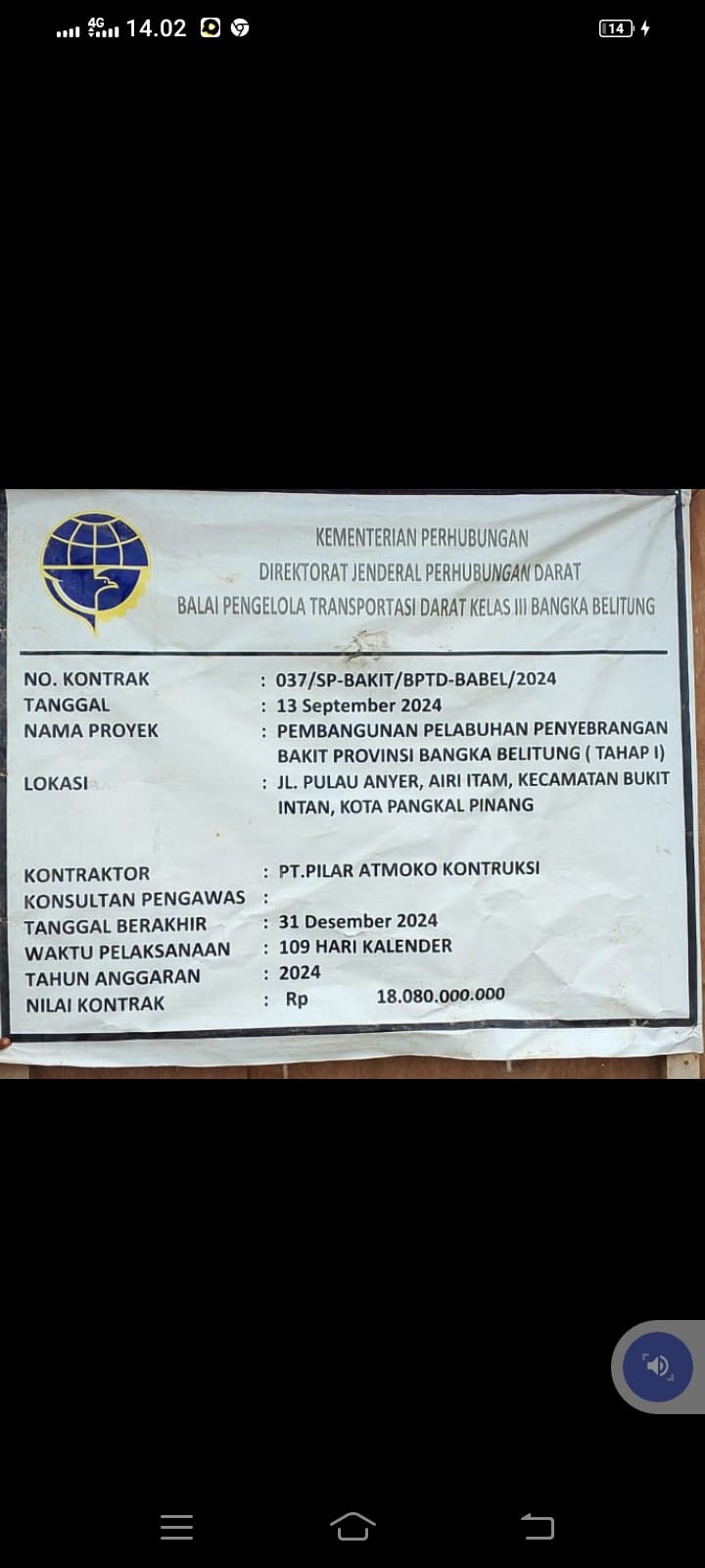 Tender ulang pembangunan Pelabuhan Mantung Belinyu (Tahap I) dimenangkan PT. Karya Dwiputra Indonesia dengan harga negosiasi Rp 23.157.694.188,68. Anehnya yang melaksanakan pekerjaan di lapangan adalah PT. Karya Nusantara – KSO sesuai kontrak nomor PL. 104/4/15/BPTD Babel/2024 tanggal 22 Oktober 2024, nilai kontrak Rp 23.171.70.000,-, waktu pelaksanaan 70 hari kerja yang berakhir pada 31 Desember 2024