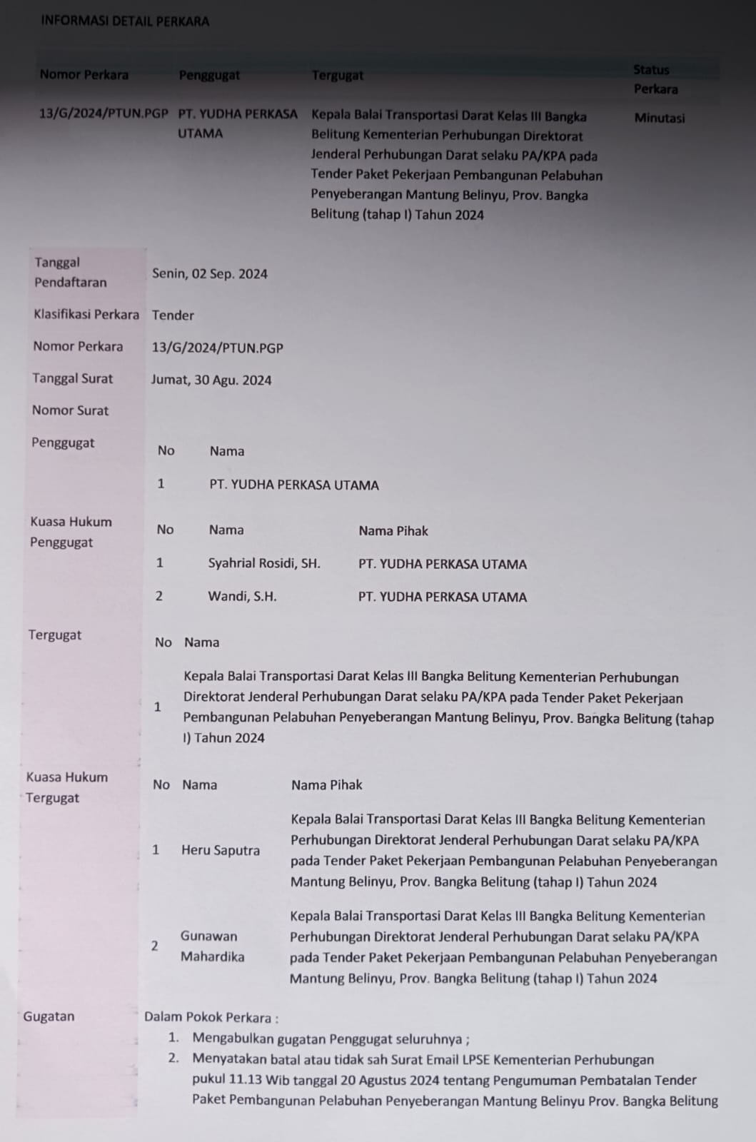 Pengumuman Pembatalan Tender Paket Pembangunan Pelabuhan Penyeberangan Mantung Belinyu Prov. Bangka Belitung (Tahap I) yang disampaikan melalui surat Email Tgl. 20 Agustus 2024 mendapat perlawanan dari pihak PT. Yudha Perkasa Utama. Melalui kuasa hukumnya Syahrial Rosidi, SH dan Wandi, SH, menggugat Kepala BPTD Kelas III Bangka Belitung selaku PA/KPA di PTUN Pangkalpinang dengan Nomor Perkara 13/G/2024/PTUN.PGP tanggal pendaftaran 02 September 2024. Hanya saja Gugatan tersebut kemudian dicabut pada tanggal 9 Oktober 2024.