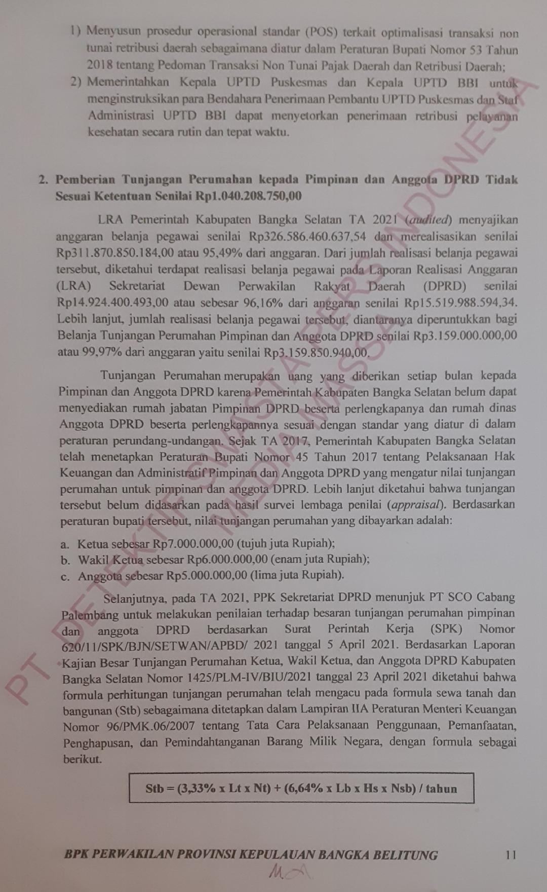Dalam Laporan Hasil Pemeriksaan (LHP) Badan Pemeriksa Keuangan Republik Indonesia (BPK RI) atas Laporan Keuangan Pemerintah Kabupaten Bangka Selatan tahun 2021, LHP atas Sistem Pengendalian Intern dan Kepatuhan Terhadap Ketentuan Peraturan Perundang-undangan Nomor 86.B/LHP/XVIII.PPG/05/2022 tanggal 27 Mei 2022 dipaparkan Pemberian Tunjangan Perumahan Pimpinan dan Anggota DPRD Kabupaten Bangka Selatan tahun anggaran 2021 selama 9 bulan (April s/d Desember 2021) tidak sesuai ketentuan sebesar Rp 1.040.208.750,-.