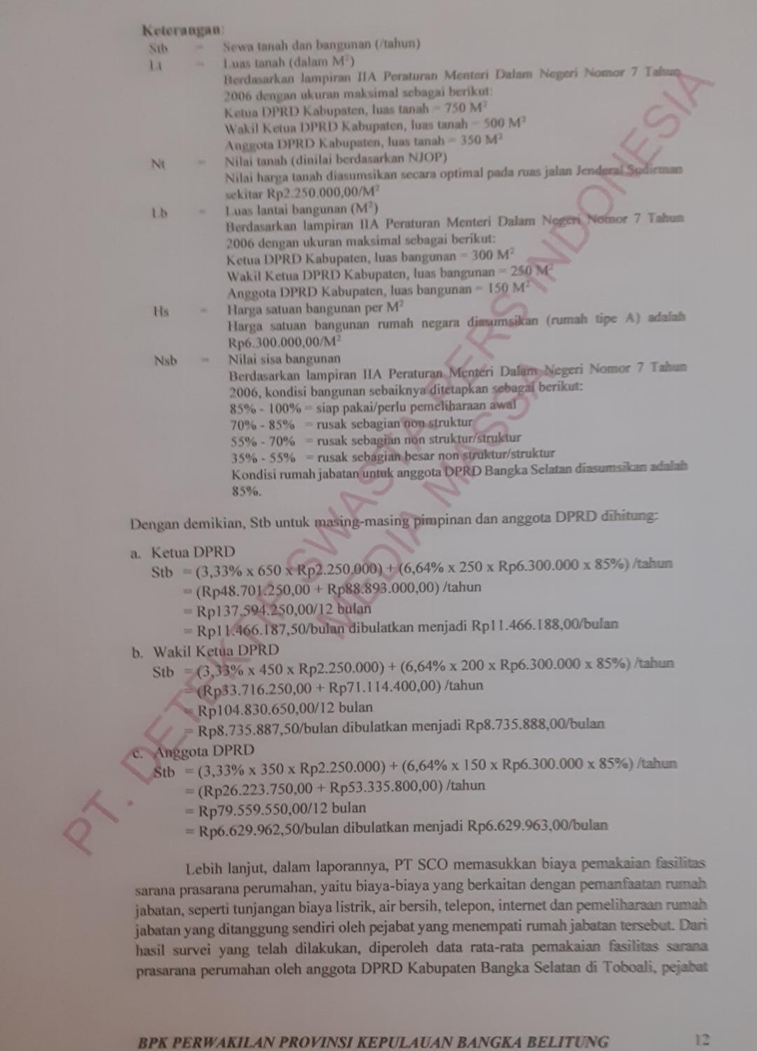 Bila dihitung berdasarkan Peraturan Menteri Keuangan (PMK) No. 96/PMK.06/2007 tentang Tata Cara Pelaksanaan Penggunaan, Pemanfaatan, Penghapusan dan Pemindahtanganan Barang Milik Negara, Lampiran IIA dengan formula : Stb = (3,33% x Lt x Nt) + (6,64% x Lb x Hs x Nsb)/tahun , maka Besaran Tunjangan Perumahan Pimpinan dan Anggota DPRD Kabupaten Bangka Selatan Tahun 2021 adalah : Ketua DPRD sebesar Rp 11.466.188,- per bulan; Wakil Ketua DPRD sebesar Rp 8.735.888,- per bulan; Anggota DPRD sebesar Rp 6.629.963,- per bulan.