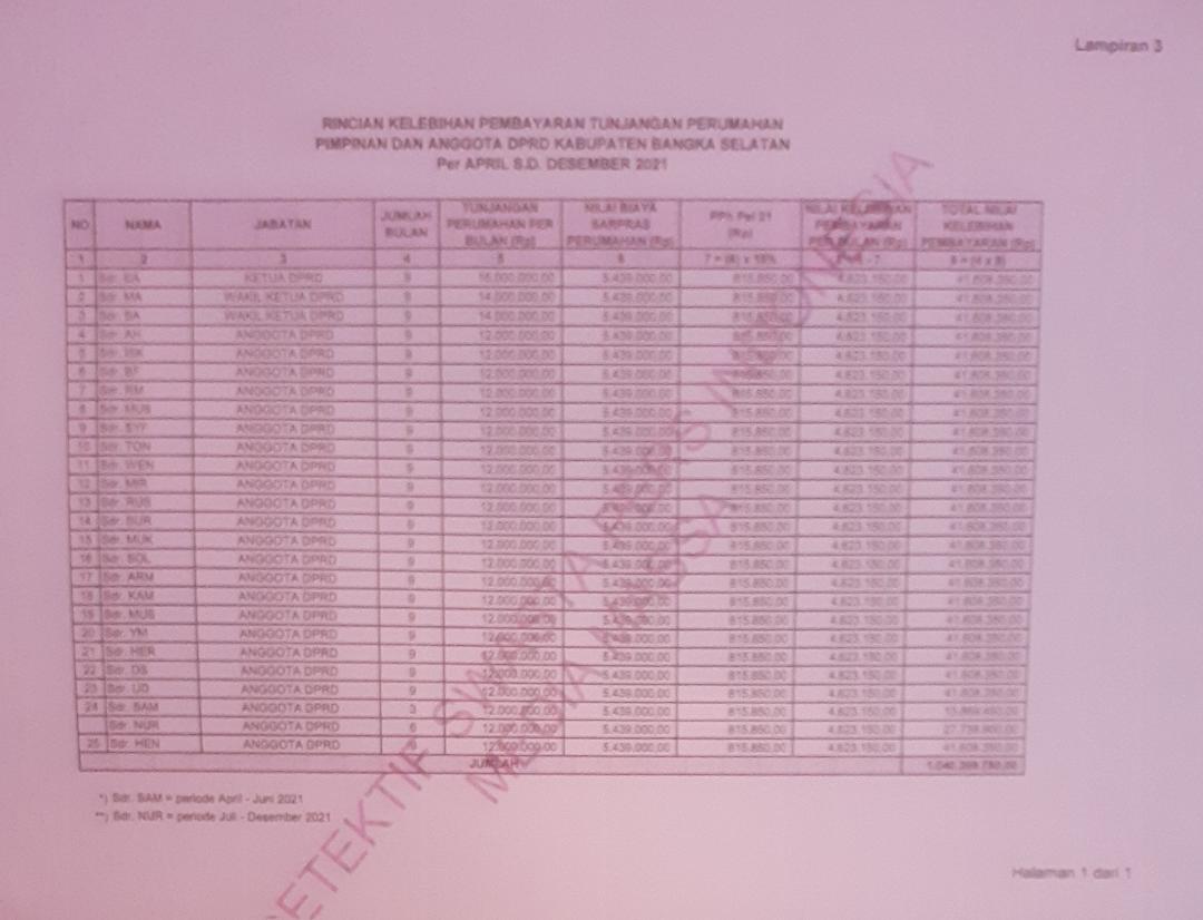 Bangka, Detektifswasta.xyz – Besaran Tunjangan Perumahan Pimpinan dan Anggota DPRD Kabupaten Bangka Selatan periode 2019-2024 yang ditetapkan dalam Peraturan Bupati No. 19 tahun 2021 tidak sesuai dengan amanat Peraturan Pemerintah No. 18 tahun 2017. Akibatnya, terhitung mulai bulan April – Desember 2021 saja telah terjadi pembayaran tidak sesuai ketentuan sebesar Rp 1 Miliar lebih.