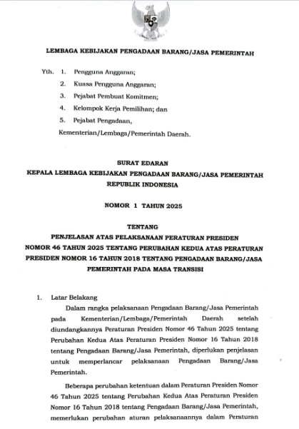 Perbuatan Pokja Pemilihan tersebut diduga tidak sesuai dengan Surat Edaran Kepala LKPP No. 1 tahun 2025 tanggal 2 Juni 2025 tentang Penjelasan atas Pelaksanaan Perpres No. 46 tahun 2025 tentang perubahan kedua atas Perpres No. 16 tahun 2018 tentang Pengadaan Barang/Jasa Pemerintah pada Masa Transisi.