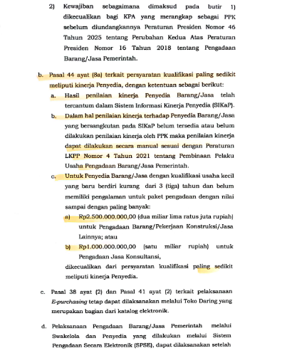 Khusus untuk Penyedia Barang/Jasa dengan kualifikasi usaha kecil yang baru berdiri kurang dari 3 (tiga) tahun dan belum memiliki pengalaman untuk paket pengadaan dengan nilai sampai dengan paling banyak Rp 2,5 Miliar untuk Pengadaan Barang/Pekerjaan Konstruksi/Jasa Lainnya; atau Rp 1 Miliar untuk Pengadaan Jasa Konsultansi, dikecualikan dari persyaratan kualifikasi paling sedikit meliputi kinerja Penyedia.