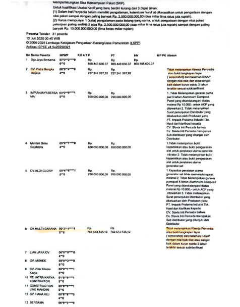 Pokja Pemilihan dengan sengaja menggugurkan Penawaran peserta yang menyampaikan harga tawaran yang lebih menguntungkan negara dengan alasan tidak melampirkan Kinerja Penyedia atau bukti tangkapan layar (screenshot) dari Halaman SiKAP dengan nilai baik dan atau sangat baik dalam kurun waktu 3 tahun terakhir sesuai Subklasifikasi.