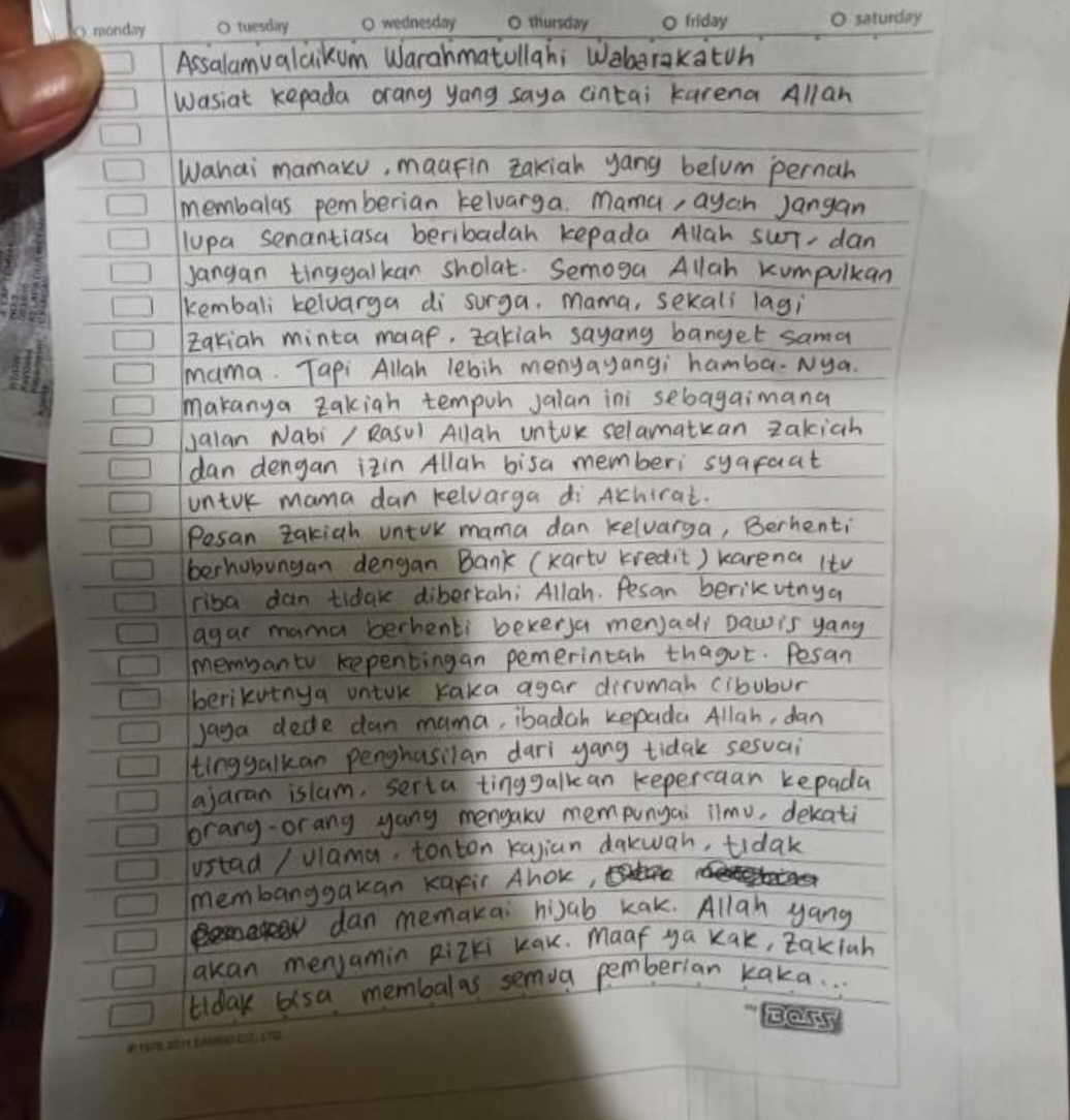 Pesan selanjutnya, Zakiah Aini minta keluarganya tidak menabung di bank karena riba. “Pesan Zakiah untuk mama dan keluarga, berhenti berhubungan dengan bank (kartu kredit) karena itu riba dan tidak diberkahi Allah,” tulis Zakiah Aini.