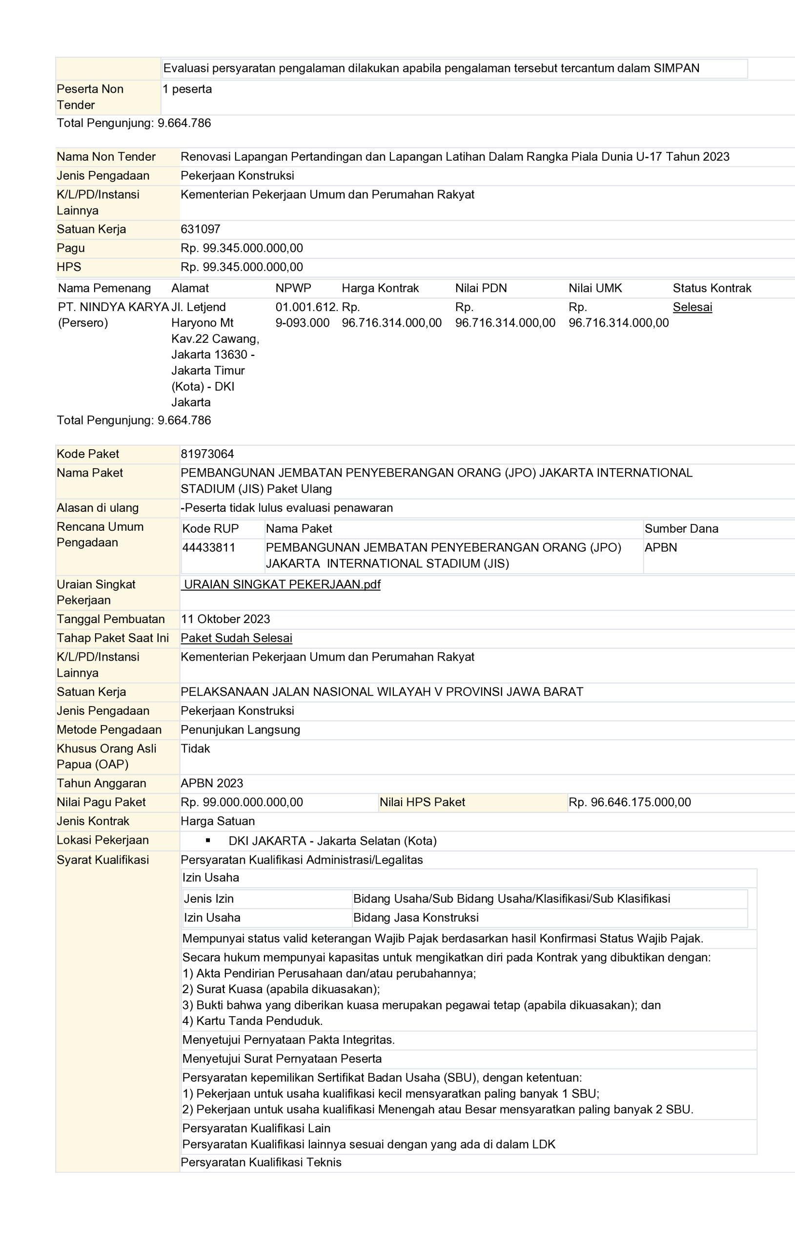 - Satuan Kerja 631097 Kementerian PUPR, Kode Paket 81848064 Renovasi Lapangan Pertandingan dan Lapangan Latihan Dalam Rangka Piala Dunia U-17 Tahun 2023, Kode RUP 44143330, Sumber Dana APBN tahun 2023, Nilai Pagu Paket = Nilai HPS Rp 99.345.000.000,-; Pemenang PT. Nindya Karya (Persero), Hasil Negosiasi Rp 96.716.314.000,-. Pengumuman Pemenang Tgl. 13 September 2023.Paket ini seharusnya hanya untuk Penyedia Pekerjaan Konstruksi Kualifikasi Usaha Besar Non – BUMN, sedangkan PT. Nindya Karya (Persero) merupakan Penyedia Pekerjaan Konstruksi Kualifikasi Usaha Besar BUMN