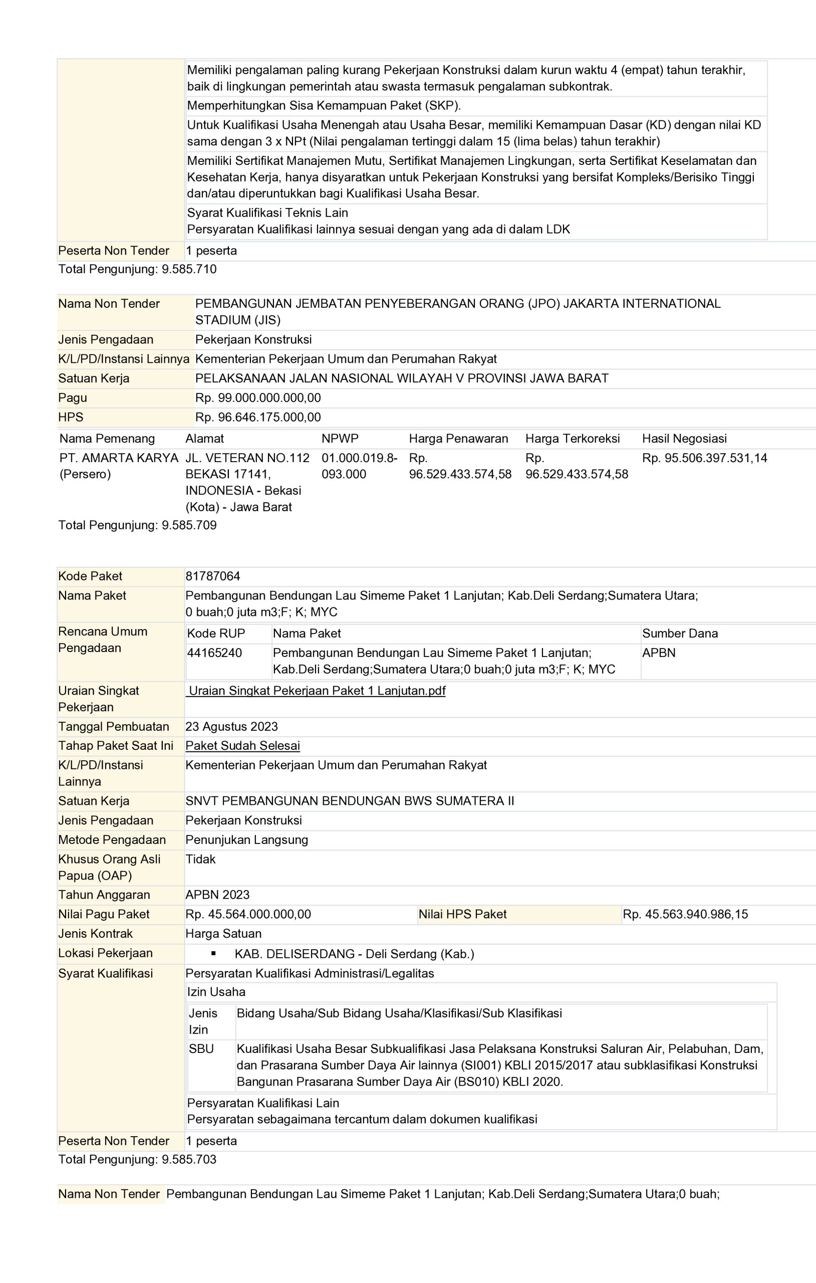 - Satuan Kerja SNVT Pembangunan Bendungan BWS Sumatera Utara, Kode Paket 81787064 : Pembangunan Bendungan Lau Simeme Paket 1 Lanjutan Kab. Deli Serdang Sumatera Utara, Kode RUP 44165240, Dana APBN 2023, Nilai Pagu Rp 45.564.000.000,-, Nilai HPS Rp 45.563.940.988,15; Pemenang Wijaya Karya (Persero) Tbk, Harga Kontrak/Nilai UMK Rp 45.549.515.577,-. Pengumuman Pemenang Tgl. 6 Oktober 2023.Paket ini seharusnya hanya untuk Penyedia Pekerjaan Konstruksi Kualifikasi Usaha Menengah, sedangkan PT. Wijaya Karya (Persero) Tbk merupakan Penyedia Pekerjaan Konstruksi Kualifikasi Usaha Besar BUMN.