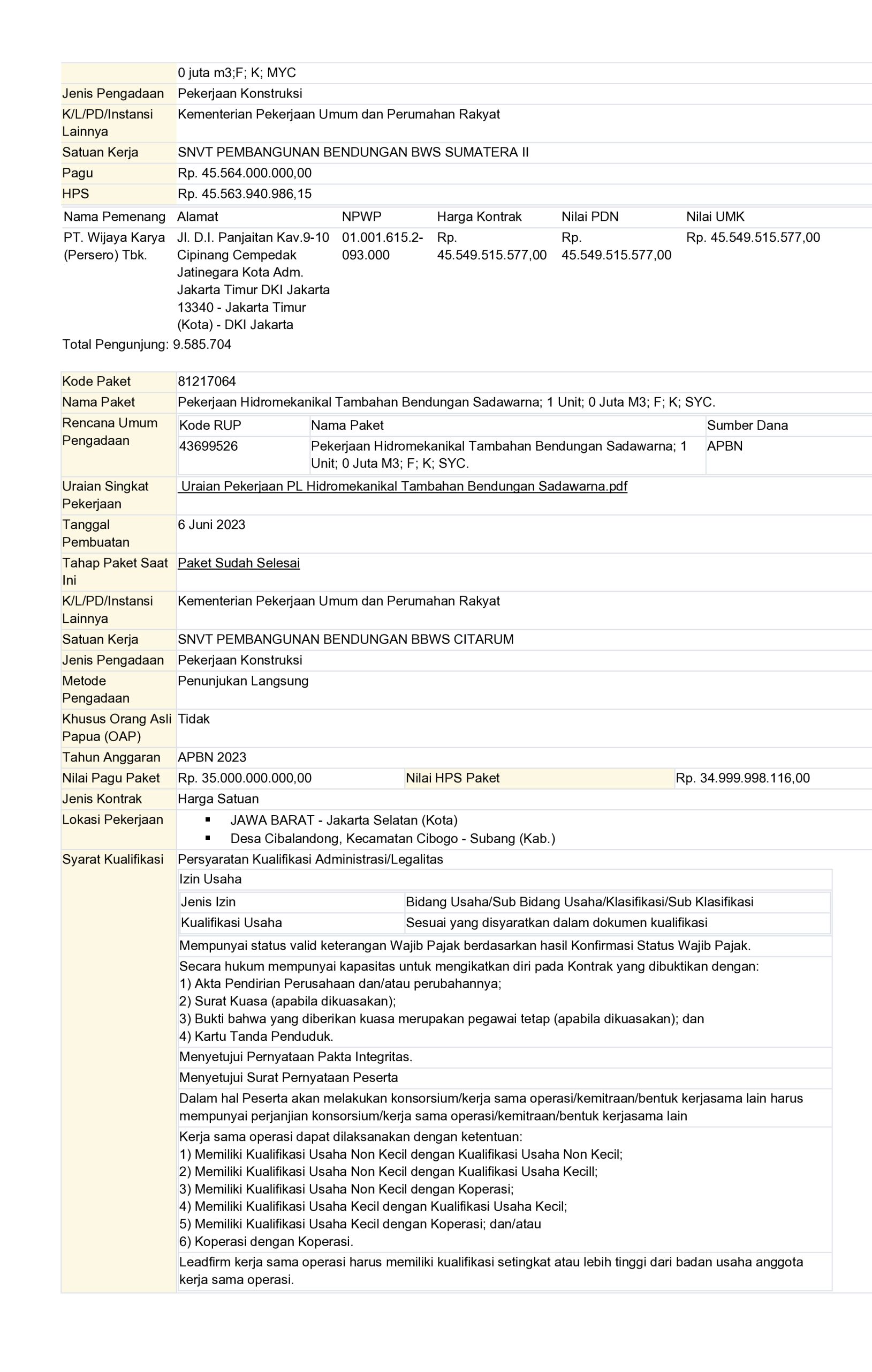 - Satuan Kerja SNVT Pembangunan Bendungan BBWS Citarum, Kode Paket 81217064 Pekerjaan Hidromekanikal Tambahan Bendungan Sadawarna, Kode RUP 43699526, Sumber Dana APBN 2023, Nilai Pagu Rp 35.000.000.000,-, Nilai HPS Rp 34.999.998.116,-; Pemenang PT. Wijaya Karya (Persero) Tbk, Hasil Negosiasi Rp 34.852.595.836,57. Pengumuman Pemenang Tgl. 20 Juni 2023. Paket ini seharusnya hanya untuk Penyedia Pekerjaan Konstruksi Kualifikasi Usaha Menengah, sedangkan PT. Wijaya Karya (Persero) Tbk merupakan Penyedia Pekerjaan Konstruksi Kualifikasi Usaha Besar BUMN