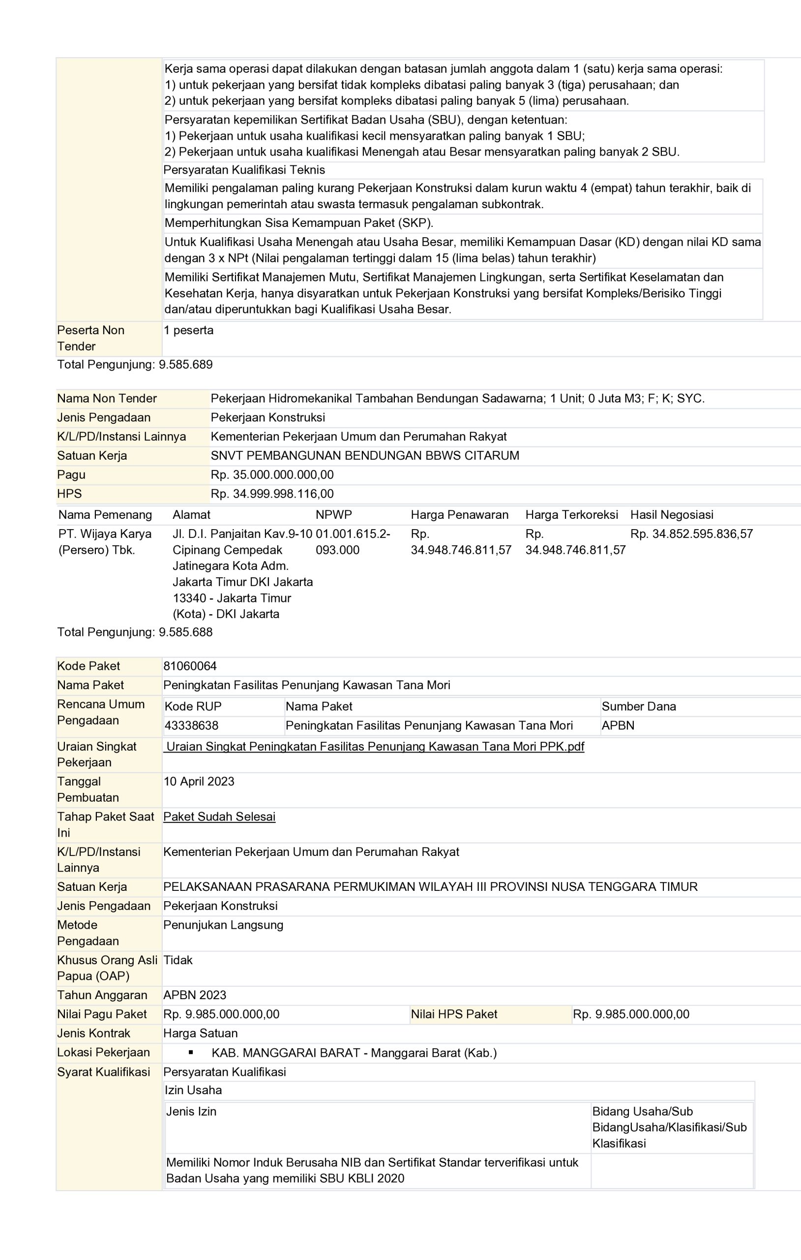 - Satuan KerjaPelaksanaan Prasarana Permukiman Wilayah III Provinsi Nusa Tenggara Timur, Kode Paket 81060064 Peningkatan Fasilitas Penunjang Kawasan Tana Mori, Kode RUP 43338638, Sumber Dana APBN 2023, Nilai Pagu Paket Rp. 9.985.000.000,-, Nilai HPS Rp 9.985.000.000,-; Pemenang PT. Nindya Karya (Persero), Hasil Negosiasi Rp 9.858.856.000,-. Pengumuman Pemenang Tgl. 2 Mei 2023.Paket ini seharusnya hanya untuk Penyedia Pekerjaan Konstruksi Kualifikasi Usaha Kecil, sedangkan PT. Nindya Karya (Persero) merupakan Penyedia Pekerjaan Konstruksi Kualifikasi Usaha Besar BUMN