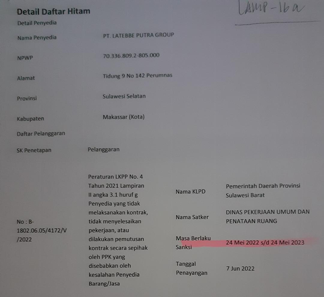 “Pejabat Pembuat Komitmen (PPK) di Universitas Halu Oleo, Kendari Sulawesi Tenggara menerbitkan SPPBJ dan menandatangani perikatan kontrak dengan PT. Lattebe Putra Group (LPG), pada Tgl. 24 MEI 2022, padahal PT. Lattebe Putra Group, NPWP 70.336.809.2-805.000 telah dikenakan SANKSI DAFTAR HITAM NASIONAL, LARANGAN MENGIKUTI TENDER Mulai Tgl. 24 MEI 2022 s/d 24 MEI 2023. Sanksi Daftar Hitam tersebut ditetapkan oleh Dinas Pekerjaan Umum dan Penataan Ruang Pemerintah Daerah Provinsi Sulawesi Barat dengan SK. Penetapan No : B-1802.06.05/4172/V/2022 dan telah ditayangkan sejak Tgl. 7 Juni 2022”