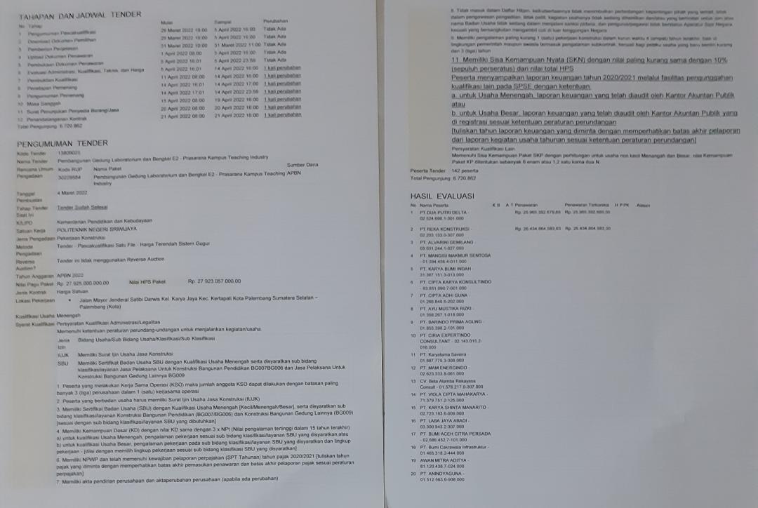 Dugaan penyimpangan diantaranya pada tender 2 paket pekerjaan konstruksi di Satuan Kerja Politeknik Negeri Sriwijaya, Kode Tender 13809025 PEMBANGUNAN GEDUNG LABORATORIUM DAN BENGKEL E2 – PRASARANA KAMPUS TEACHING INDUSTRY, APBN 2022, Metode Pengadaan : Tender – Pascakualifikasi Satu File – Sistem Gugur, Nilai Pagu Rp 27.925.000.000,-, Nilai HPS Rp 27.923.057.000,-, Pemenang Tender PT. Dua Putri Delta (Palembang) Harga Penawaran/Terkoreksi Rp 25.965.392.680,-, dan Kode Tender 13810025 PEMBANGUNAN GEDUNG KULIAH D1 – PRASARANA KAMPUS TEACHING INDUSTRI, APBN 2022, Nilai Pagu Rp. 20.252.575.000,-, Nilai HPS Rp 20.252.440.000,-, Pemenang Tender PT. Andeska Berlian Utama (Palembang), Harga Penawaran/ Terkoreksi Rp 19.222.782.584,-