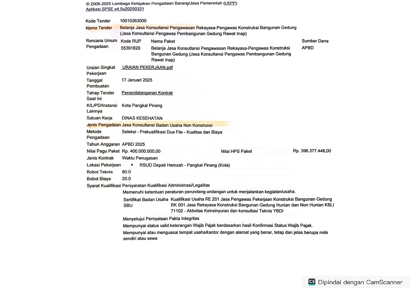 Penyimpangan yang paling mendasar diduga terjadi pada pelaksanaan Tender/Seleksi Belanja Jasa Konsultansi Pengawasan Rekayasa – Pengawas Konstruksi Bangunan Gedung dana APBD tahun 2025 (Jasa Konsultansi Pengawasan Pembangunan Gedung Rawat Inap), Kode Tender 10010363000 dan Kode RUP 55391820, Jenis Pengadaan Jasa Konsultansi Badan Usaha Non Konstruksi, nilai HPS Rp 396.377.448,- dengan Pemenang CV. Cipta Bangun Konsultant (Palembang), harga penawaran/harga terkoreksi Rp 394.725.324,- dan