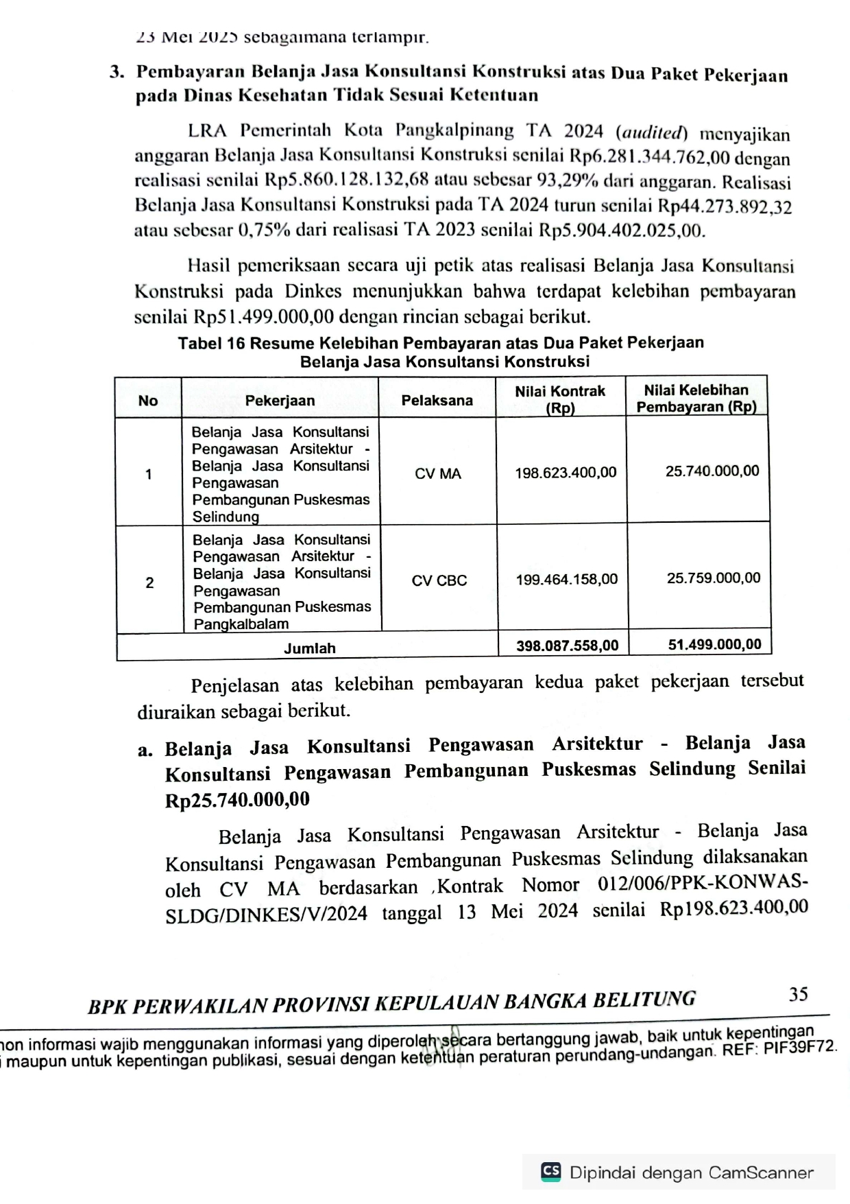 Pelaksanaan pengadaan sejumlah Pekerjaan Jasa Konstruksi tahun 2025 dilingkup Dinas Kesehatan Kota Pangkalpinang Provinsi Bangka Belitung diduga tidak sesuai dengan amanat Peraturan Presiden (Perpres) No. 46 tahun 2025 tentang perubahan kedua Perpres No. 16 tahun 2018, Peraturan LKPP No. 11 tahun 2021 tentang Pedoman Perencanaan Pengadaan Barang/Jasa Pemerintah, Peraturan LKPP No. 12 tahun 2021 tentang Pedoman
