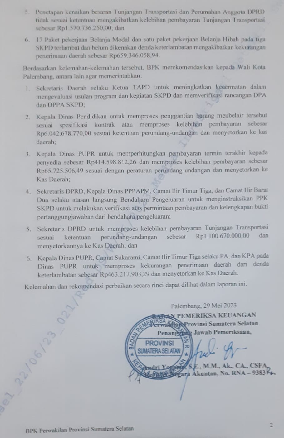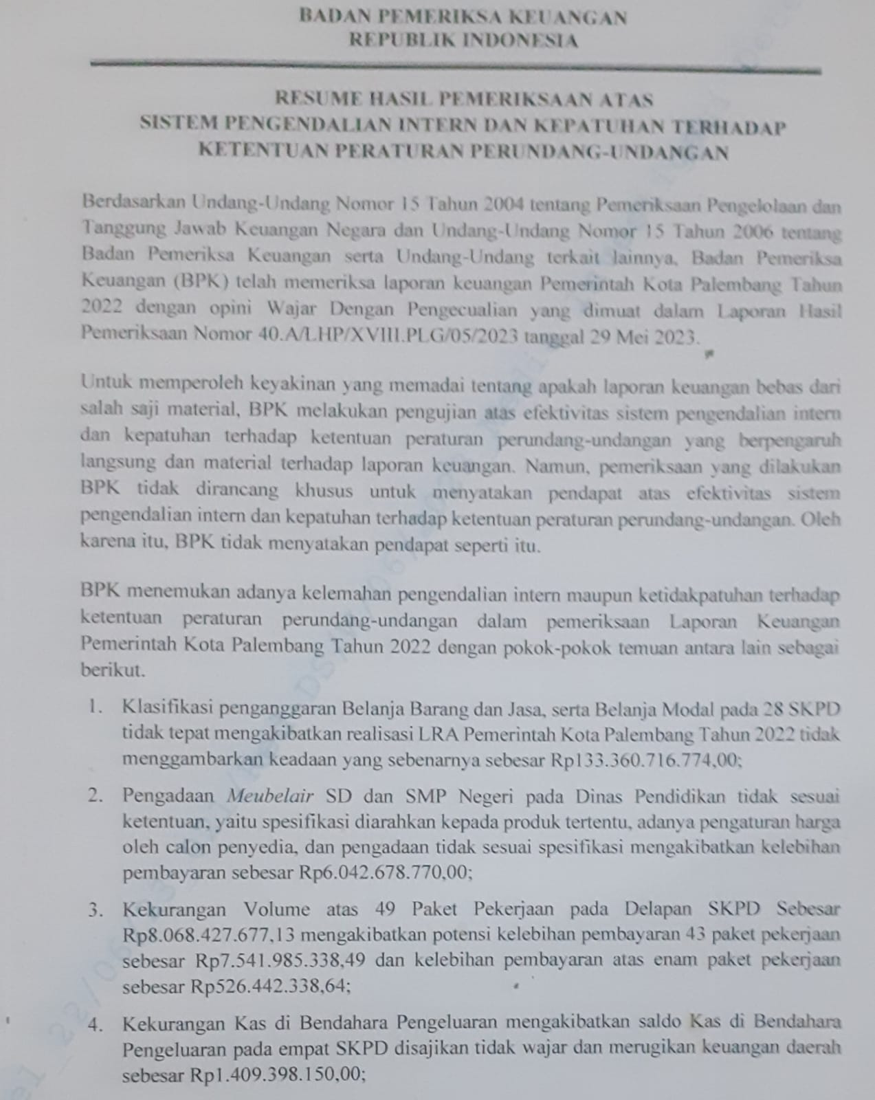 Untuk diketahui dalam LHP No. 40.B/LHP/XVIII.PLG/05/2023 tanggal 29 Mei 2023, BPK juga menemukan sejumlah kelemahan pengendalian intern maupun ketidakpatuhan terhadap ketentuan peraturan perundang-undangan dalam Laporan Keuangan Pemerintah Kota Palembang Tahun 2022 antara lain :