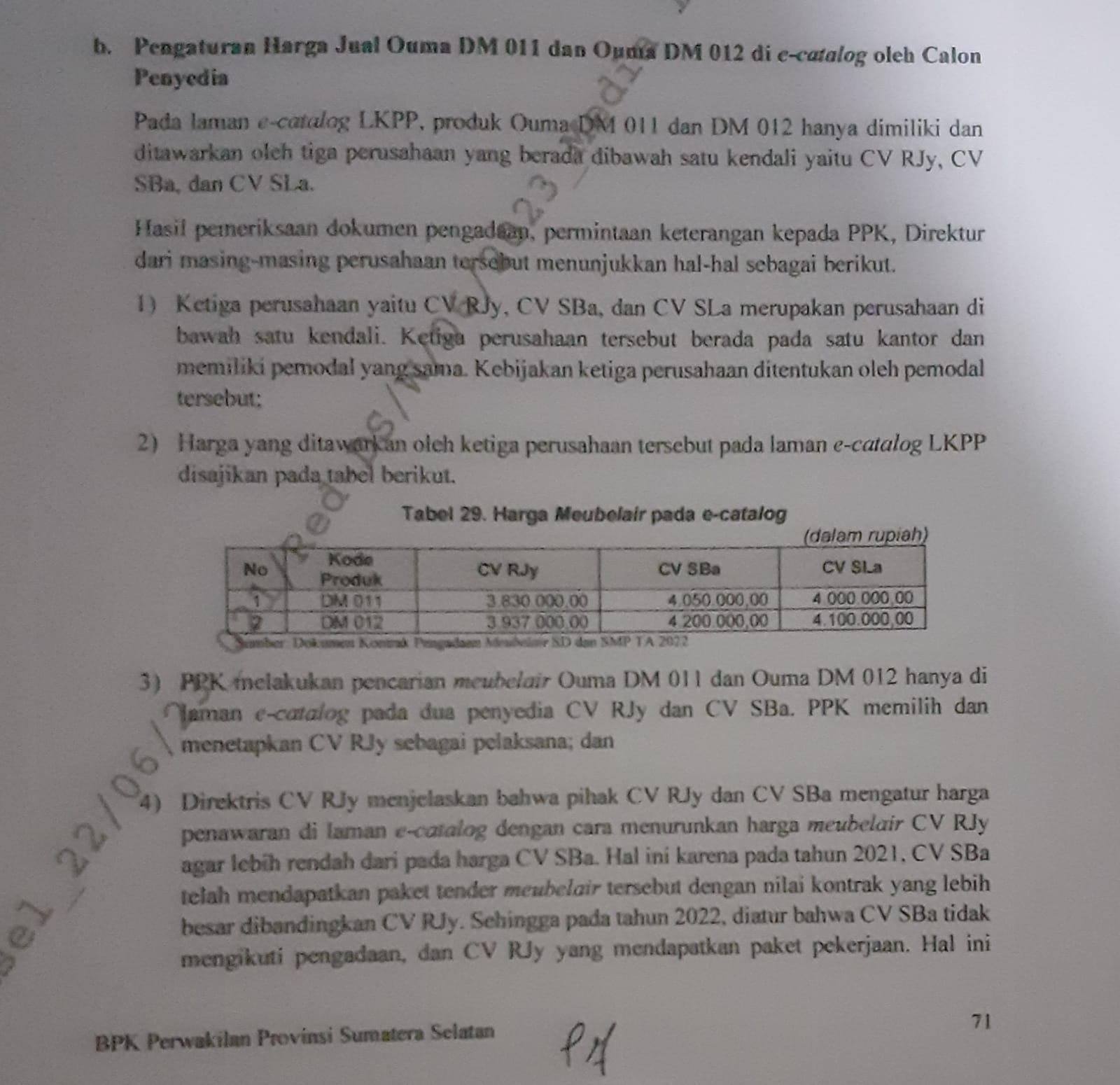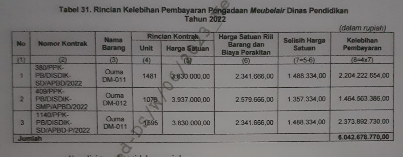 Pada 3 paket Pengadaan Meubelair Meja Kursi Siswa TA 2022, total nilai kontrak Rp 16.343.403.000,- yang dipercayakan kepada penyedia CV. RJy dengan Kontrak No. 380/PPK-PB/DISDIK-SD/APBD/2022 Tgl. 27 Juni 2022, jenis barang Meja Kursi Siswa Quma DM-011, jumlah 1456, nilai kontrak Rp 5.685.680.000,-; Kontrak No. 409/PPK-PB/DISDIK/SMP/APBD/2022 Tgl. 27 Juni 2022, jenis barang Meja Kursi Siswa Quma DM-012, jumlah 1.104, nilai kontrak Rp 4.429.248.000,-; dan Kontrak No. 1140/PPK-PB/DISDIK-SD/APBD-P/2022 Tgl. 3 November 2022, jenis barang Meja Kursi, jumlah 1.595, nilai kontrak Rp 6.228.475.000,- ditemukan penyimpangan berupa : Spesifikasi Meubelair Diarahkan kepada Produk Tertentu; Pengaturan Harga Jual Ouma DM 011 dan Ouma DM 012 di e-catalog oleh Calon Penyedia; dan Pengadaan Meubelair Tidak Sesuai Spesifikasi dan telah mengakibatkan kelebihan pembayaran kepada CV. RJy sebesar Rp 6.042.678.770,- (atau 36,97% dari total nilai kontrak – Red)