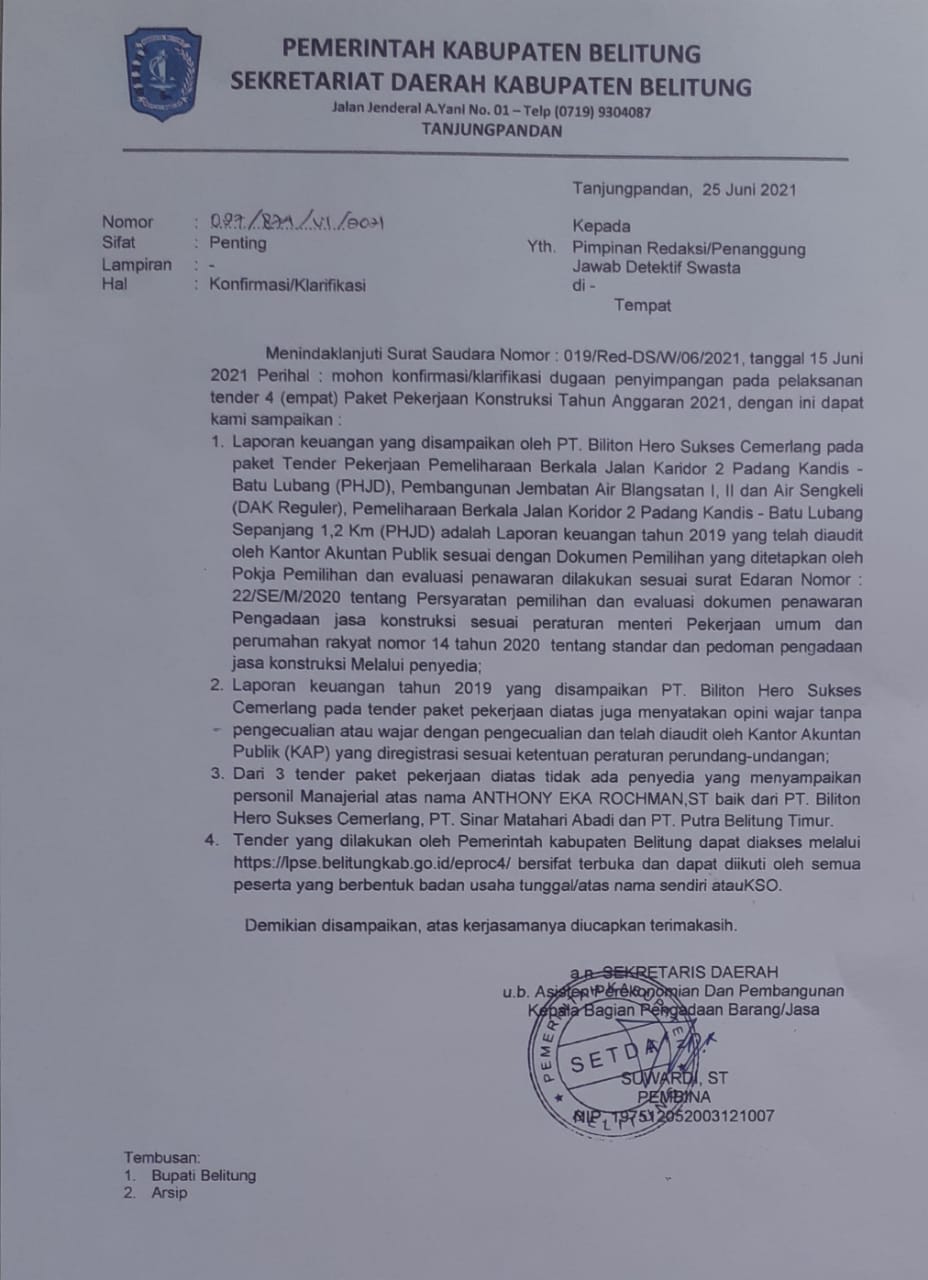 Dalam penjelasan tertulis No. 027/874/VI/2021 tanggal 25 Juni 2021 yang merupakan jawaban pemintaan Konfirmasi/Klarifikasi DETEKTIFSWASTA No. 019/Red-DS/W/06/2021 tanggal 15 Juni 2021, Suwardi menjelaskan Laporan Keuangan yang disampaikan oleh PT. Billiton Hero Sukses Cemerlang pada Tender paket Pekerjaan Berkala Jalan Koridor 2 Padang Kandis – Batu Lubang (PHDJ); paket Pembangunan Jembatan Air Blangsatan I, II dan Air Sengkeli (DAK Reguler), paket Pemeliharaan Berkala Jalan Koridor 2 Padang Kandis – Batu Lubang Sepanjang 1,2 Km (PHJD) adalah Laporan keuangan tahun 2019 yang telah diaudit oleh Kantor Akuntan Publik sesuai dengan Dokumen Pemilihan yang ditetapkan oleh Pokja Pemilihan dan Evaluasi Penawaran dilakukan Peraturan Menteri PUPR Nomor 14 tahun 2020 tentang Standar dan pedoman Pengadaan Jasa Konstruksi Melalui Penyedia.