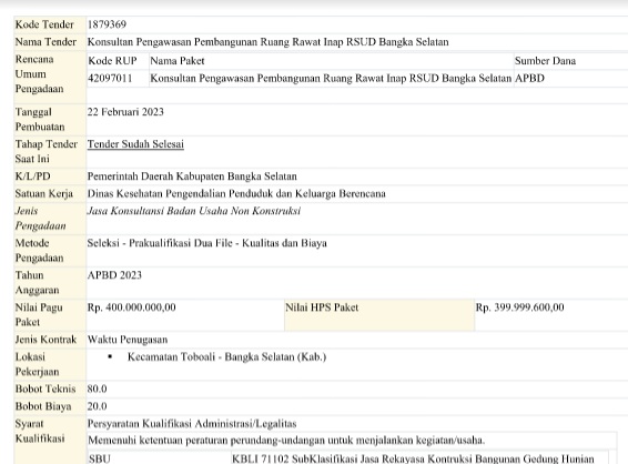 - Kode Tender 1879369, Konsultan Pengawasan Pembangunan Ruang Rawat Inap RSUD Bangka Selatan, Kode RUP 42097011, Sumber Dana APBD 2023; Satuan Kerja Dinas Kesehatan Pengendalian Penduduk dan Keluarga Berencana; Jenis Pengadaan JASA KONSULTANSI BADAN USAHA NON KONSTRUKSI, Nilai HPS Rp 399.999.600,-; Pemenang PT. Raka Tama Cipta Semesta (Bandung- Jawa Barat), Harga Negosiasi : tidak ada, Harga Penawaran/Harga Terkoreksi Rp 398.856.300,- atau 99,71% dari Nilai HPS