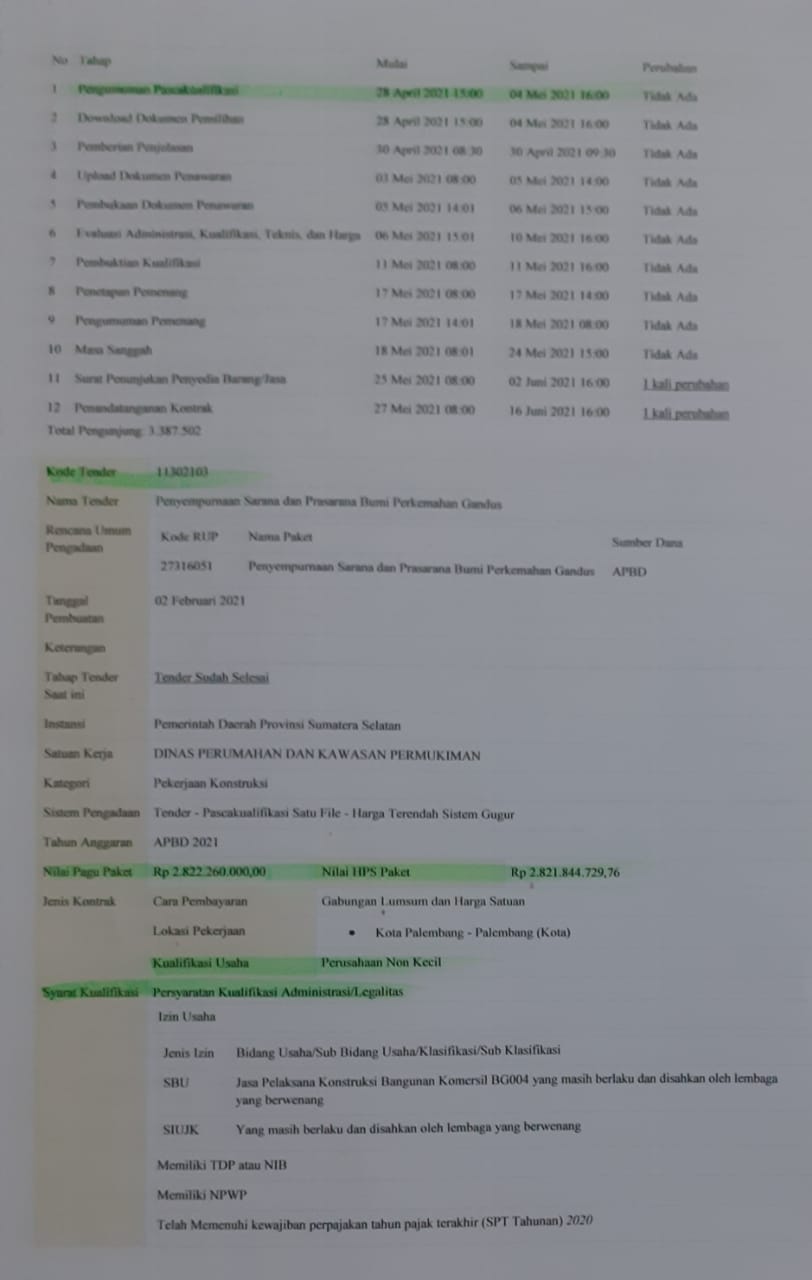 Pelaksanaan tender pekerjaan konstruksi  Penyempurnaan Sarana dan Prasarana  Bumi Perkemahan Gandus  sumber  dana APBD Sumsel tahun 2021, nilai HPS Rp 2.821.844.729,96  kode tender 113021  yang dimulai tanggal 28 April 2021 (Pengumuman Pascakualifikasi – Red)  diduga keras  melanggar Peraturan Presiden (PERPRES) Nomor 12 tahun 2021 tentang perubahan PERPRES Nomor  16 tahun 2018 tentang PENGADAAN BARANG/JASA PEMERINTAH dan Peraturan Menteri Pekerjaan Umum dan Perumahan Rakyat (Permen PUPR)  Nomor 14 tahun 2020 tentang STANDAR DAN PEDOMAN PENGADAAN JASA  KONTRUKSI  MELALUI PENYEDIA.