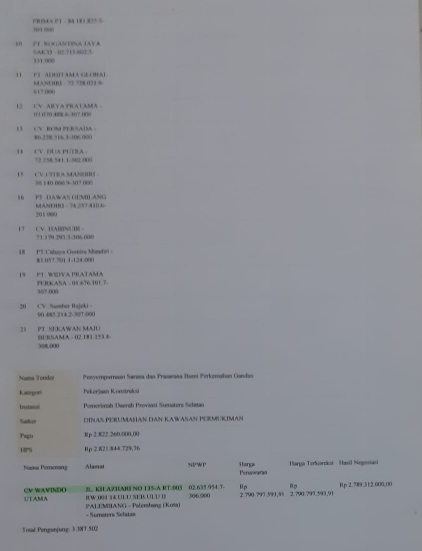Penyimpanganpun terus berlanjut.  Kuasa Pengguna Anggaran (KPA) selaku Pejabat Pembuat Komitmen (PPK) atau sebutan lainnya  pada Dinas Perumahan dan Permukiman Provinsi Sumatera Selatan yang sebenarnya memiliki kewenangan menolak atau menerima Hasil Tender yang ditetapkan Pokja Pemilihan,   langsung  menerbitkan SPPBJ dan selanjutnya  menandatangani perikatan kontrak dengan CV. Wavindo Utama selaku penyedia jasa Penyempurnaan Sarana dan Prasarana Bumi Perkemahan Gandus  dengan nilai kontrak sebesar  Rp 2.798.312.000,-.