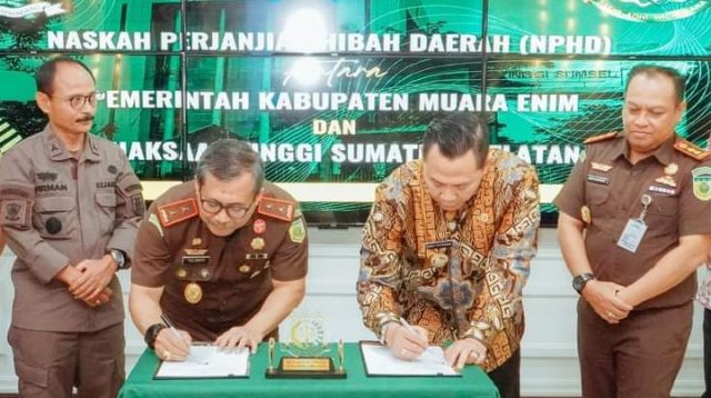 Penandatanganan Naskah Perjanjian Hibah Daerah (NPHD) antara Pemerintah Kabupaten Muara Enim dengan Kejaksaan Tinggi Sumatera Selatan (Kejati Sumsel) tentang Hibah Pembangunan Gedung Sport Center, Parkir serta Mess Eselon III dilaksanakan di kantor Kejaksaan Tinggi Sumatera Selatan pada tanggal 03 Oktober 2024 lalu oleh Pj. Bupati Muara Enim, H. Henky Putrawan, S.Pt., M.Si., M.M., dan Kepala Kejati Sumsel, Dr. Yulianto, S.H., M.H.