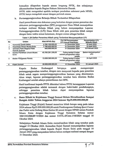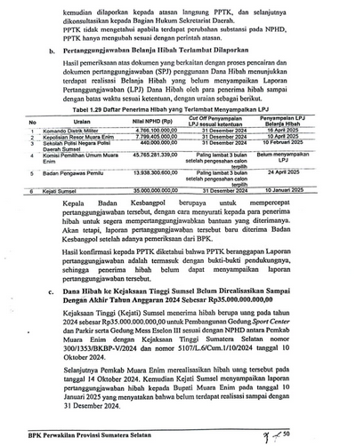Selanjutnya Pemkab Muara Enim merealisasikan Hibah Uang tersebut pada tanggal 14 Oktober 2024. Kemudian Kejati Sumsel menyampaikan Laporan Pertanggungjawaban Hibah kepada Bupati Muara Enim pada tanggal 10 Januari 2025 yang menyatakan belum terdapat realisasi sampai dengan 31 Desember 2024. Berdasarkan hasil pemeriksaan fisik lapangan pada kantor Kejati Sumsel yang dilakukan BPK bersama dengan PPK Kejati, PPTK Badan Kesbangpol, dan Inspektorat diketahui bahwa kegiatan yang seharusnya dilakukan pada Tahun 2024 belum terdapat realisasi atas kegiatan pembangunan tersebut.