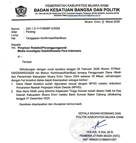 Kepala Badan Kesatuan Bangsa dan Politik Kabupaten Muara Enim, Holika, S. Sos.,M.Si dalam penjelasan tertulis No. 200.1.3/226/BKBP-V/2026 tanggal 4 Maret 2026 menyatakan, Dana Hibah tersebut sudah digunakan sesuai dengan NPHD melalui Adendum Perubahan Naskah Perjanjian Hibah Daerah (NPHD), tulis Holika tanpa merinci nomor dan tanggal Adendum Perubahan NPHD dimaksud.