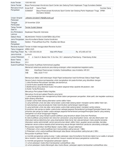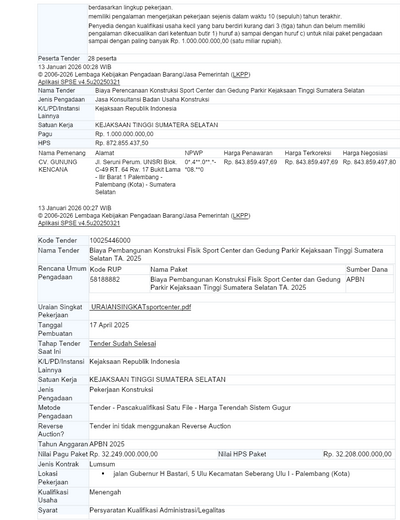 - Biaya Perencanaan Konstruksi Sport Center dan Gedung Parkir Kejaksaan Tinggi Sumsel, sumber Dana APBN 2025, Penyedia Jasa CV. Gunung Kencana, nilai kontrak Rp 843.859.497,80,-.
