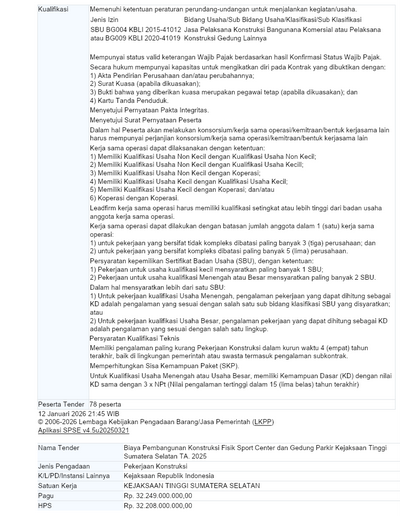 - Biaya Pembangunan Konstruksi Sport Center dan Gedung Parkir Kejaksaan Tinggi Sumsel, sumber Dana APBN 2025, Penyedia Jasa PT. Osa Putra Batom, nilai kontrak Rp 31.889.000.000,-.