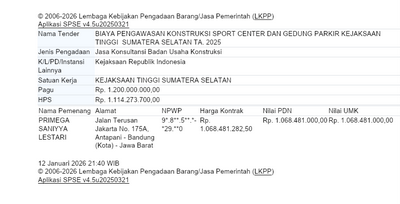 - Biaya Pengawasan Konstruksi Sport Center dan Gedung Parkir Kejaksaan Tinggi Sumsel, sumber Dana APBN 2025, Penyedia Jasa Primega Saniyya Lestari, nilai kontrak Rp 1.068.481.000,-.