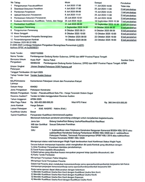 - Kode Tender 10027152000, Pembangunan Gedung Kantor Gubernur, DPRD dan MRP Provinsi Papua Tengah, Kode RUP 58485436, Nilai Pagu Rp 365.455.000.000,-, Nilai HPS Rp 360.635.000.000,-, APBN 2025, Satuan Kerja Pelaksanaan Prasarana Permukiman Wilayah I Provinsi Papua, Pemenang Tender : PT. Pembangunan Perumahan (Persero) Tbk, Harga Penawaran/Harga Terkoreksi Rp 355.436.000.000,-, Harga Negosiasi Rp 355.362.185.000,01.