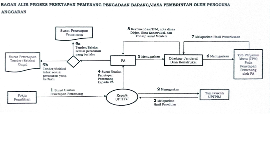 Adapun Bagan Alir proses Penetapan Pemenang Pengadaan Barang/Jasa Pemerintah yang diatur dalam Instruksi Menteri PUPR No. 01/IN/M/2022 yang sampai saat ini masih berlaku : Pokja Pemilihan menyampaikan Surat Usulan Pemenang kepada Kepala UPTPBJ, kemudian Kepala UPTPBJ menugaskan Tim Peneliti UPTPBJ, selanjutnya Tim Peneliti melaporkan Hasil Penelitian kepada Kepala UPTPBJ yang dilanjutkan dengan Surat Usulan Penetapan Pemenang kepada PA. Setelah menerima Usulan dari Kepala UPTPBJ, PA menugaskan Direktur Jenderal Bina Konstruksi (Dirjen Bikon), selanjutnya Dirjen Bikon menugaskan Tim Pejamin Mutu (TPM) pada Penetapan Pemenang oleh PA. Kemudian TPM melaporkan hasil pemeriksaan kepada Dirjen Bikon. Selanjutnya Dirjen Bikon membuat konsep surat Menteri berupa Surat Penetapan Pemenang bila Tender/Seleksi sudah sesuai peraturan yang berlaku, atau Surat Penetapan Tender/Seleksi Gagal (bila Tender/Seleksi tidak sesuai peraturan yang berlaku