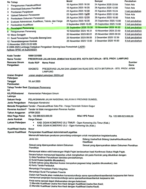 - Kode Tender 10068706000, Pembangunan Jalan Oksibil – Iwur, Kode RUP 60074563, Nilai Pagu = Nilai HPS Rp 269.468.491.000,-, APBN 2025, Satuan Kerja PJN Wilayah IV Provinsi Papua Jaya Wijaya, Pemenang PT. Modern Widya Tehnical, Harga Penawaran/Harga Terkoreksi Rp 258.280.647.688,90, Harga Negosiasi Rp 258.261.551.408,75