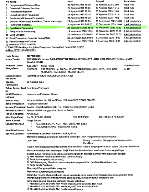 - Kode Tender 10074086000, Preservasi Jalan dan Jembatan Ruas Mangunjaya – Bts. Kab. Muba/Bts. Kab. Mura – Muara Beliti, Kode RUP 55167672, Nilai Pagu Paket Rp 191.277.871.000,-, Nilai HPS Paket Rp 191.277.871.000,-, Satuan Kerja PJN Wilayah I Provinsi Sumsel
