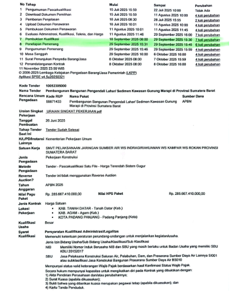 - Kode Tender 1005235000, Pembangunan Pengendali Lahar/Sedimen Kawasan Gunung Marapi di Sumatera Barat, APBN 2025, Kode RUP 597871433, Nilai Pagu Paket Rp 285.667.410.000,-, Nilai HPS Paket Rp 285.667.410.000,-, Satuan Kerja PJSA WS Indragiriakuaman WS Kampar WS Rokan Provinsi Sumatera Barat.