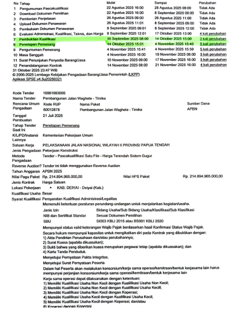 - Kode Tender 10061993000, Pembangunan Jalan Waghete – Timika, Kode RUP 60012878, Nilai Pagu = Nilai HPS Rp 214.894.965.000,-, APBN 2025, Satuan Kerja PJN Wilayah II Provinsi Papua Tanah Merah