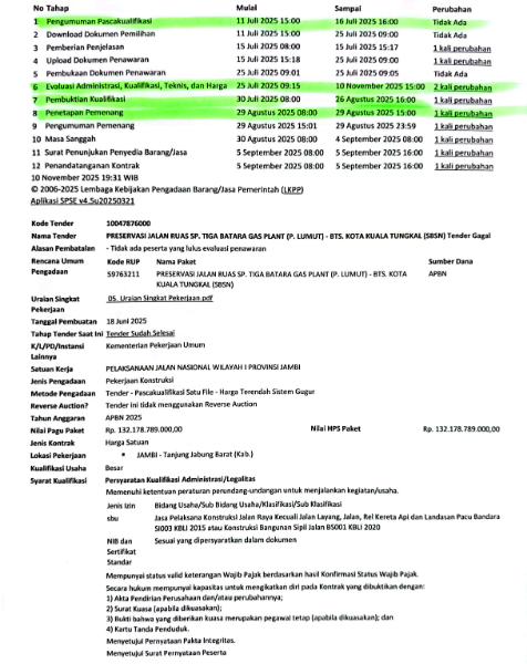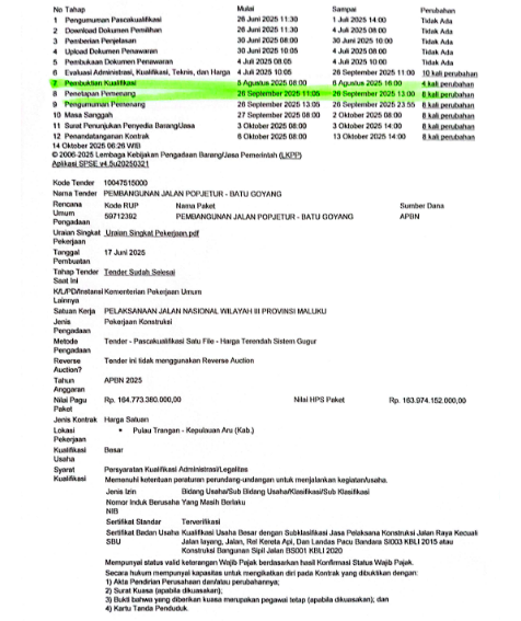 - Pembuktian Kualifikasi : Mulai 8 Agustus 2025 Sampai 14 Agustus 2025 (1 kali perubahan)