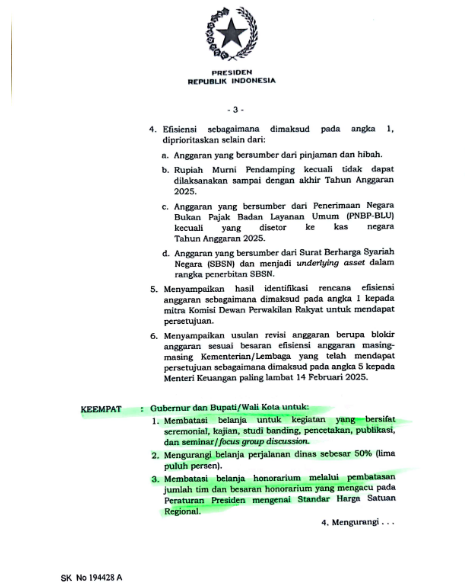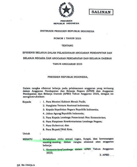 Dalam Instruksi Presiden Nomor 1 tahun 2025, Presiden Prabowo Subianto menginstruksikan kepada Gubernur dan Bupati/Walikota, diantaranya untuk mengurangi belanja perjalanan dinas sebesar 50% (lima puluh persen); membatasi belanja untuk kegiatan yang bersifat seremonial, kajian, studi banding, pencetakan, publikasi, dan seminar/focus discussion; membatasi belanja honorarium melalui pembatasan jumlah tim dan besaran honorarium yang mengacu pada Peraturan Presiden mengenai Standar Harga Satuan Regional; dan mengurangi Belanja yang bersifat pendukung dan tidak memiliki output yang terukur.