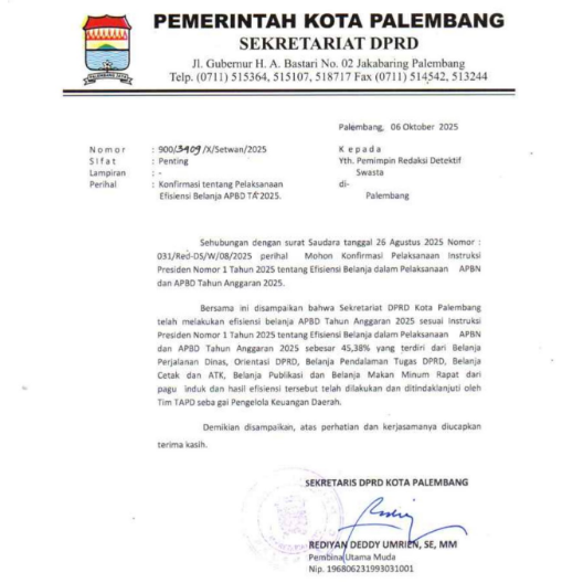 Menjawab permintaan Konfirmasi DETEKTIFSWASTA No. 031/Red-DS/W/08/2025 tanggal 26 Agustus 2025, Sekretaris DPRD Kota Palembang, Erdiyan Deddy Umrien, SE, MM melalui surat No. 900/3409/X/Setwan/2025 tanggal 06 Oktober 2025 menjelaskan Sekretariat DPRD Kota Palembang telah melakukan efisiensi belanja APBD Tahun Anggaran 2025 sesuai Instruksi Presiden No. 1 Tahun 2025 tentang Efisiensi Belanja Dalam Pelaksanaan APBN dan APBD tahun anggaran 2025 sebesar 45,38% yang terdiri dari Belanja Perjalanan Dinas, Orientasi DPRD, Belanja Pendalaman Tugas DPRD, Belanja Cetak dan ATK, Belanja Publikasi dan Belanja Makan Minum Rapat dari pagu induk dan hasil efisiensi tersebut telah dilakukan dan ditindaklanjuti oleh Tim TAPD sebagai Pengelola Keuangan Daerah.